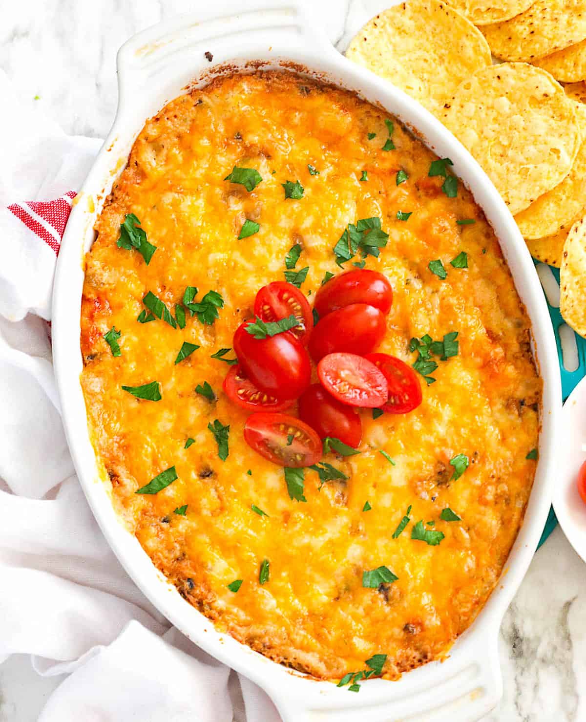 - Serve – Remove the dip from the oven, top it with chopped tomatoes and green onions, and serve it warm with tortilla chips. Enjoy!
