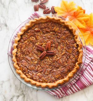 One of the biggest complaints about pecan pie is that it’s too sweet. I usually cut the sugar back just a little, but the bourbon does a huge flavor-balancing act, like vanilla extract on steroids. And no worries about being kid-friendly because the alcohol evaporates long before this pecan pie with bourbon comes out of the oven. Top it with vanilla ice cream, and you have a bunch of happy campers.