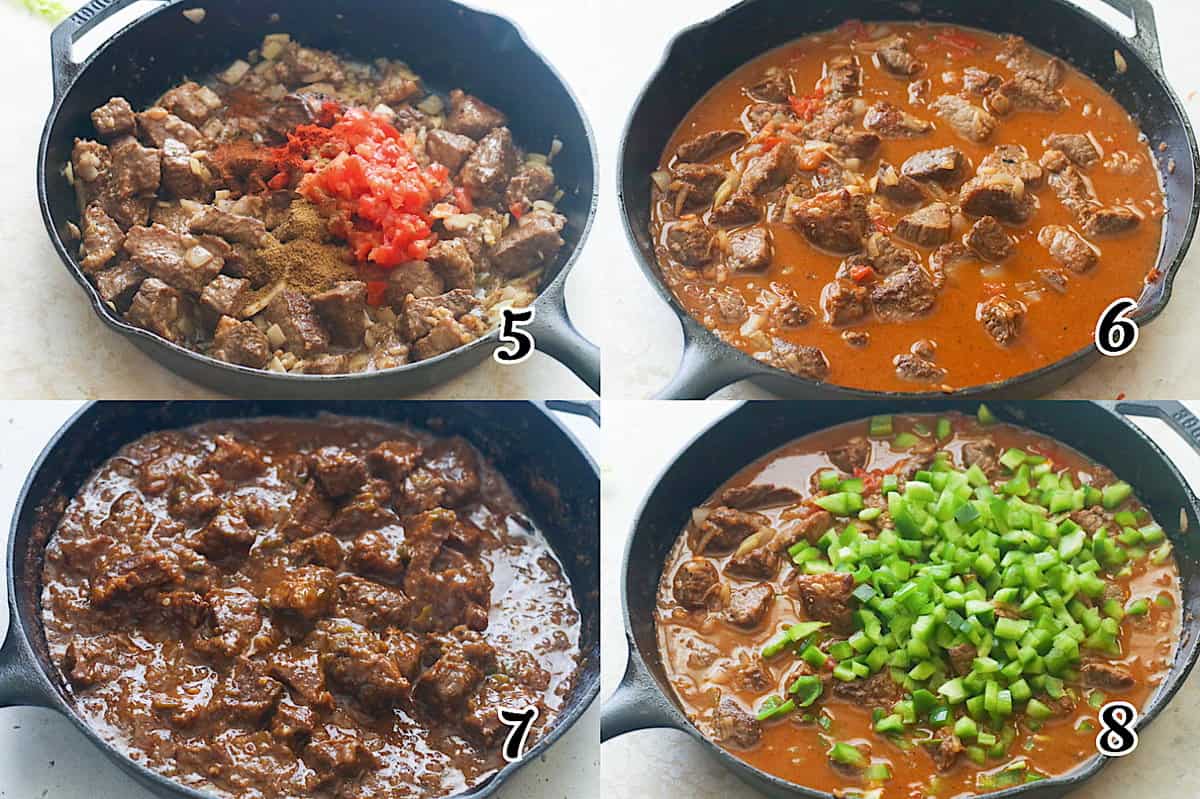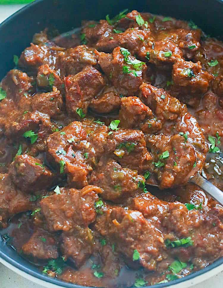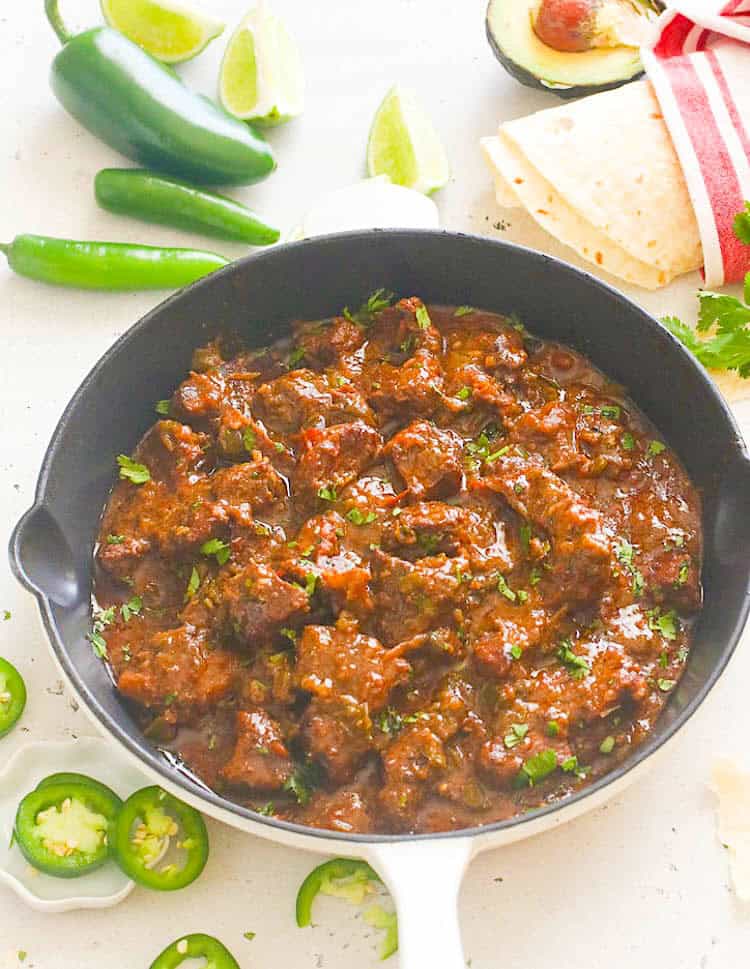 Spicy carne guisada freshly made in the skillet ready to enjoy
