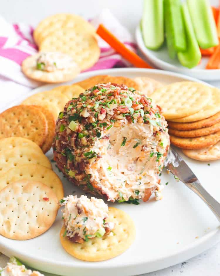 Try this fantastic cheese ball for the perfect appetizer and charcuterie board essential. Whether for the holiday season or game day appetizers, you’ve got a sure winner. A creamy spread loaded with a delicious blend of cheeses and bacon, then rolled in crunchy nuts! It’s straightforward and fun to make (and to eat).