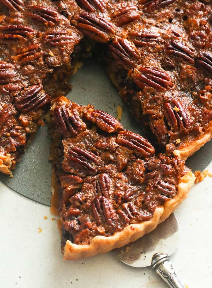 • Pecan pieces in the filling make for easier slicing than the halves. Pecan halves work better as decoration.