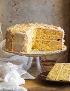 Whipped egg whites folded into the batter create a light and airy texture. Toasted coconut and full-fat coconut milk in the cake add tropical flavor and a wonderful mouthfeel. Frosted and then topped with more toasted coconut flakes takes it over the top.