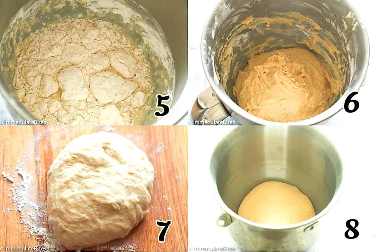 - Flour – Add 3½ cups of flour and continue mixing the dough. Add flour as needed to make a soft bread dough. (Photos 5-6)