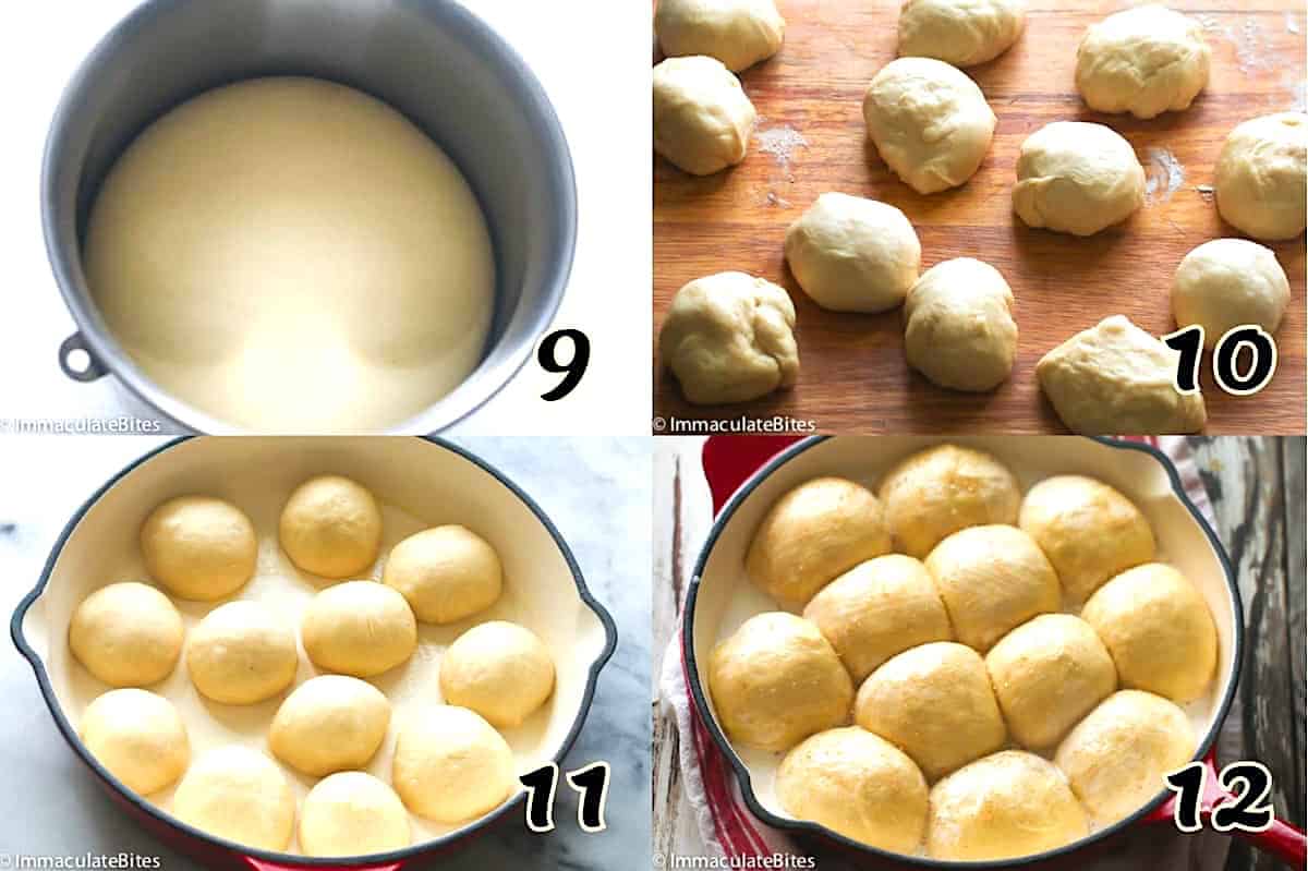 - Rolls – After the dough doubles, punch it down and divide it into 12 equal pieces – a little over 2 ounces apiece. Form round balls, tucking the edges underneath the dough, then rolling it against the board or between your palms until it’s round. (Photos 9-11)
