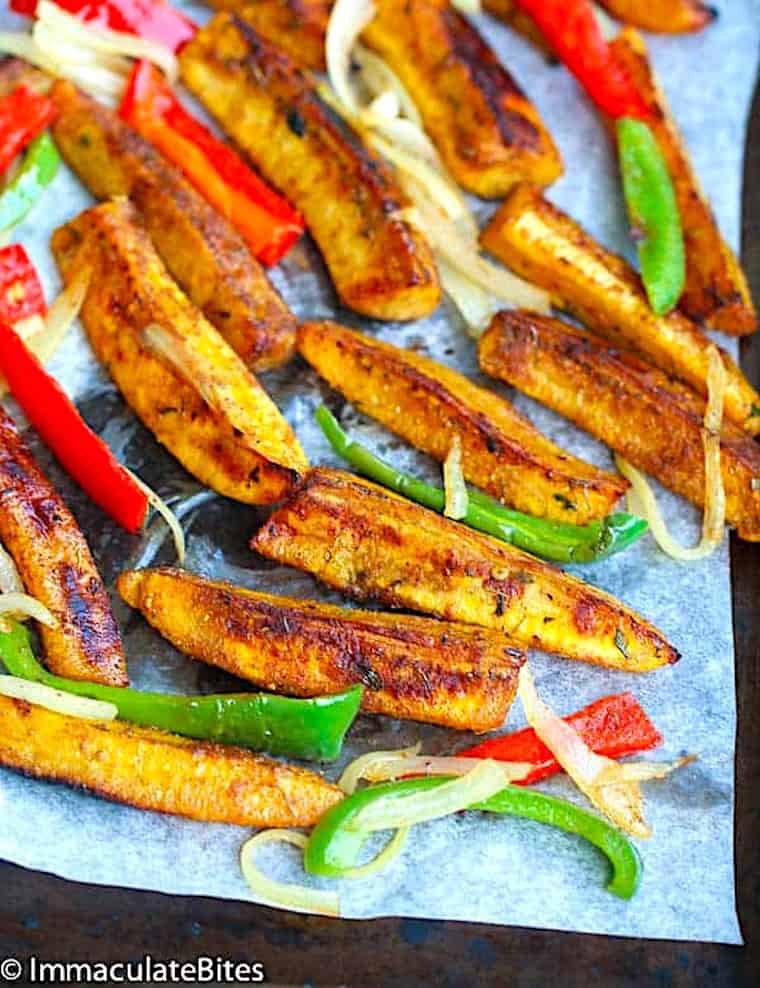 - Sauté the sliced onion for about a minute. Then add the bell pepper strips, and saute for another minute. Serve with your plantains. Enjoy!