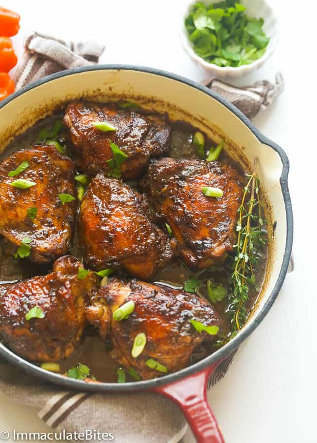 • Pour a little bit of the cooked marinade over the chicken. Adjust the oven rack so the top of the chicken is 4-5 inches below the broiler. Broil on high for 3-5 minutes or until the skin is crispy and golden brown. Don’t walk away because this happens quickly.